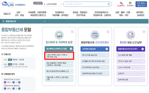② 종합부동산 포털 > 합산배제 및 과세특례 신고 > 1세대 1주택자 판단 시 주택 수 신청 제외 신청 클릭합니다.