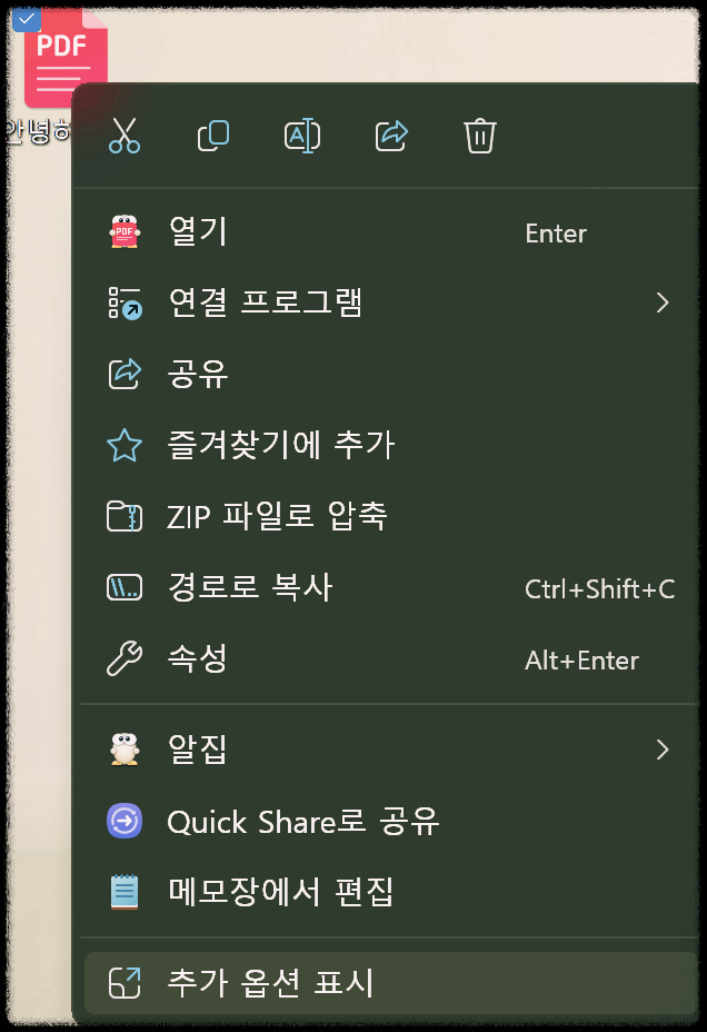 1. 암호화 하려는 파일에 오른쪽 마우스를 클릭합니다. 맨 아래에 추가 옵션 표시를 누릅니다.(노트북의 경우 해당)