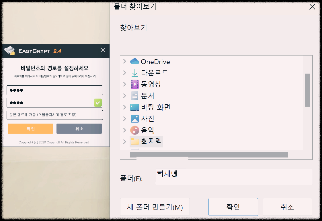 3. 비밀번호를 위, 아래에 똑같이 설정하고(비밀번호 꼭! 기억하기!) 세번째 칸을 더블클릭하여 저장할 폴더를 선택합니다.